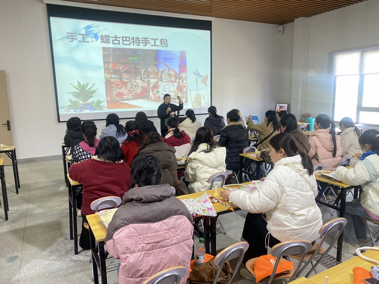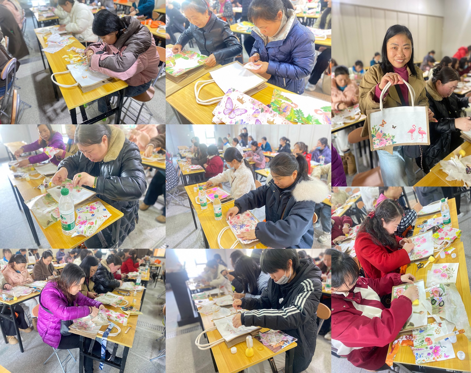 老師為大家介紹了蝶古巴特包的創(chuàng)作技巧,帶領(lǐng)大家一步步制作,從挑選復(fù)古印花紙、裁剪圖案,到使用專(zhuān)用膠水構(gòu)圖拼貼,最后利用清漆封層,無(wú)不細(xì)致講解。隨后,大家紛紛動(dòng)手,積極參與,互相幫助,現(xiàn)場(chǎng)氣氛熱烈。原本素凈的帆布包逐漸被絢麗的拼貼圖案覆蓋,成為承載公司溫情的藝術(shù)載體。