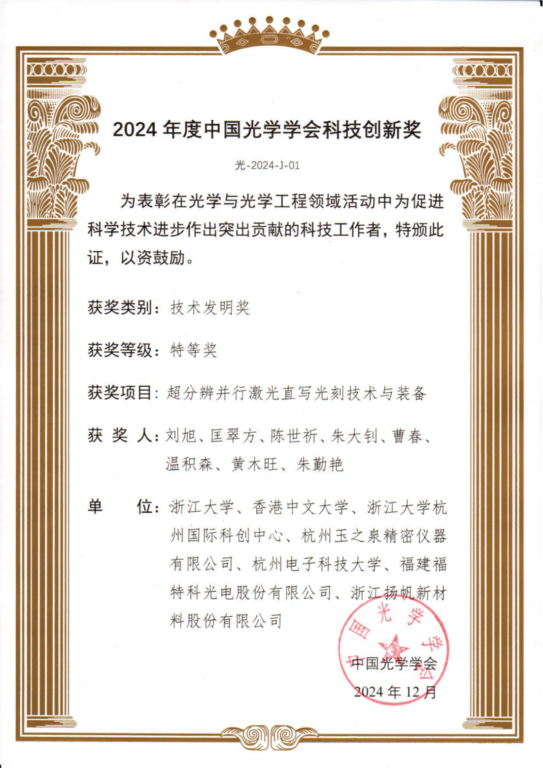 近日,中國光學學會公布了“2024年度中國光學學會科技創(chuàng)新獎評選結果”,我司作為參與單位,參與“超分辨并行激光直寫光刻技術與裝備”項目研發(fā),并榮獲科技創(chuàng)新獎特等獎。