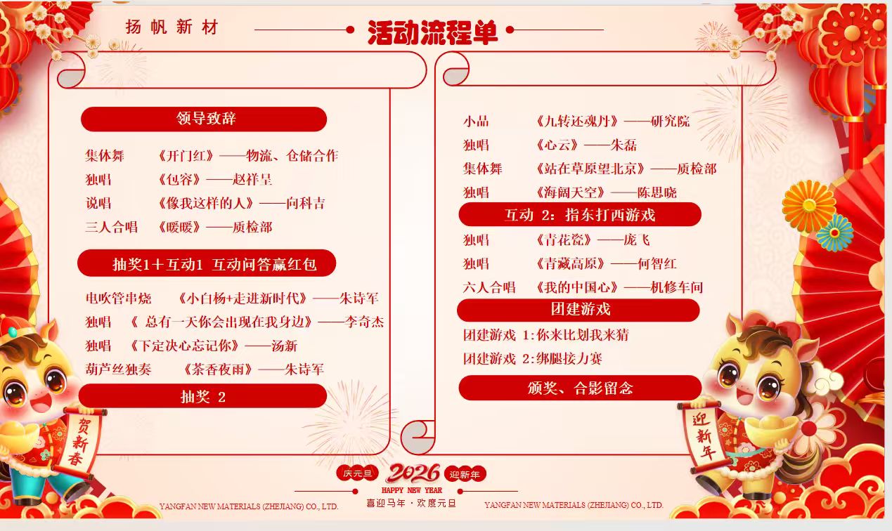 本次元旦匯演的成功舉辦,彰顯了揚帆新材料以員工為本的企業文化,也為新一年的奮斗注入了蓬勃動力。展望2026年,公司將繼續秉持“仁德創富,成己惠人”的價值觀,在新材料領域再創輝煌。